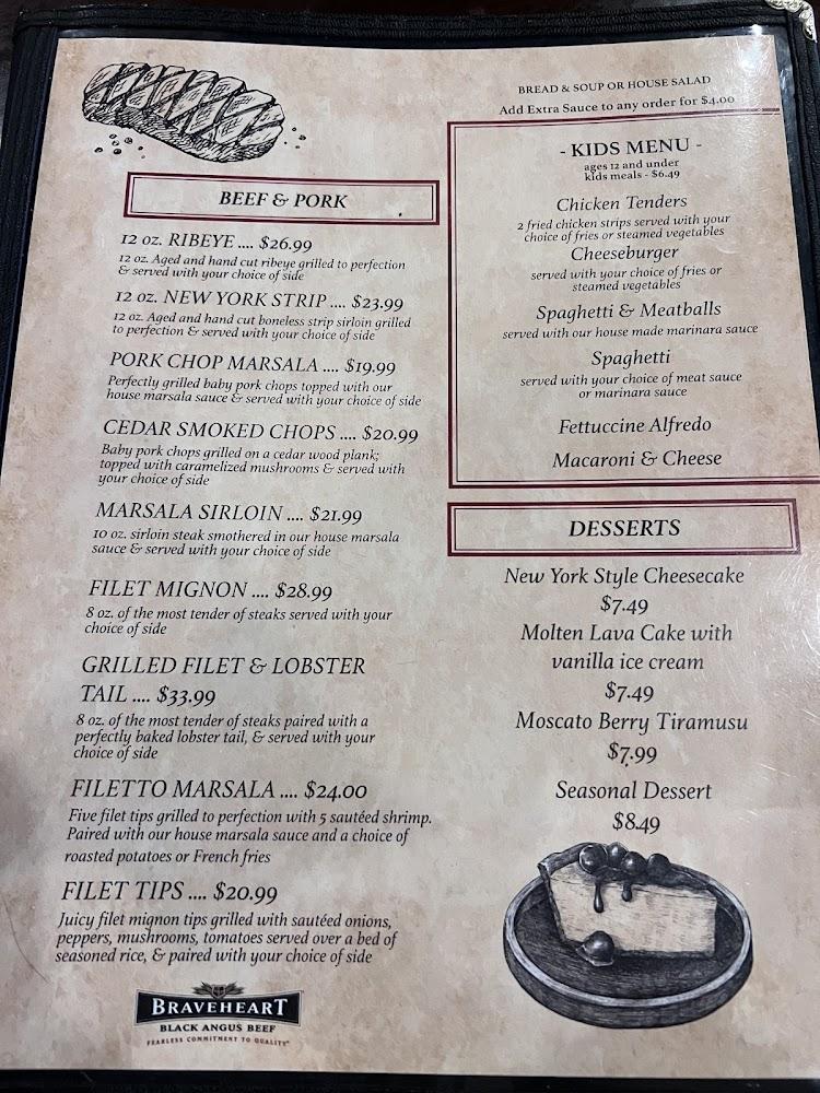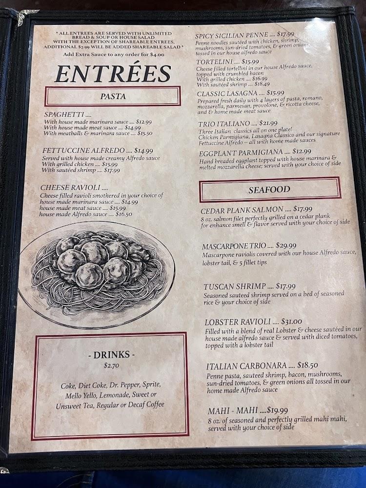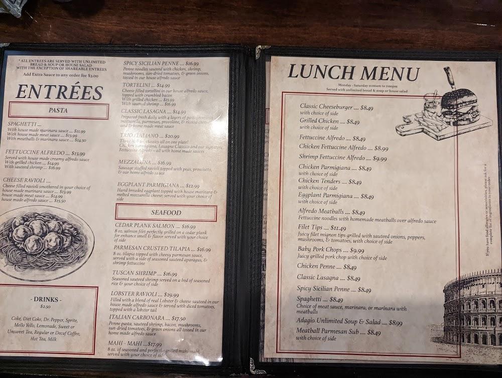 The menu at Adagio Pasta and Grill is extensive, featuring an array of Italian classics. You can find everything from rich pasta dishes to hearty pizzas. Standouts include their spaghetti, fettuccine Alfredo, and several seafood options like cedar plank salmon and lobster ravioli.
