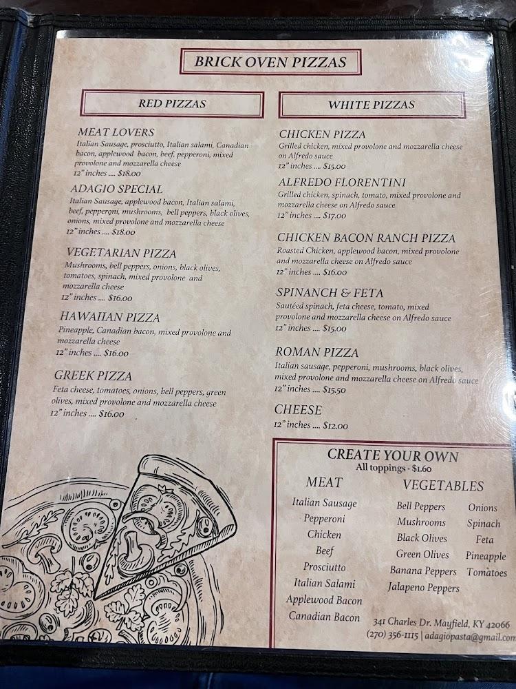Welcome to Adagio Pasta and Grill, your go-to Italian restaurant in Mayfield, KY. Nestled at 341 Charles Dr, we offer a delightful dining experience with a cozy atmosphere perfect for solo diners and groups alike. Indulge in our extensive menu featuring traditional Italian cuisine, excellent desserts, and a wide selection of wines. Enjoy the convenience of takeout, delivery, or dine-in services, all while experiencing our fast, friendly service. With accessible facilities and kid-friendly options, Adagio is ideal for everyone. Join us for lunch, dinner, or a relaxing evening out—reserve your table today!